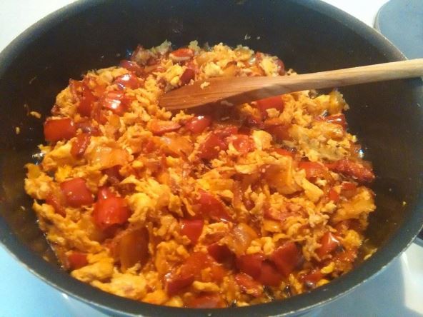Priprema: Izdinsta se luk na malo ulja, zatim se doda beli luk i paprika pa onda i paradajz. Kada sve bude skoro gotovo dodaju se jaja i začini.