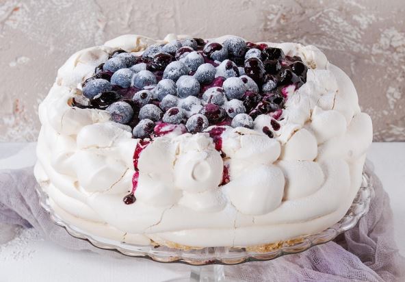 Priprema: Zagrejte rernu na 100ºC. Počnite da mutite belancai polako dodajte šećer i so i mutite 5 do 10 minuta dok se šećer ne rastopi i dok ne dobijete čvrsti sneg pa na kraju lagano umešajte prah borovnica. Zatim smesu istresite na papir za pečenje i formirajte krug odnosno oblik torte tako da u sredini ostavite udubljenje za krem.
