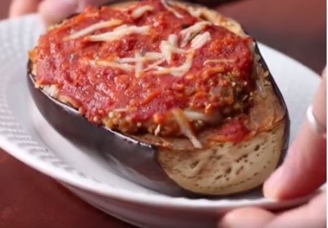 Patlidžan prepolovite, izdubite sredinu pa polovine zapecite u rerni na 250 stepeni 10ak minuta. U tiganju izdinstajte luk na maslinovom ulju zatim dodajte sredinu iz patlidžana, pileći bujon i pirinač (ili proso ili susam). Dinstajte sve desetak minuta a onda sklonite sa ringle.
