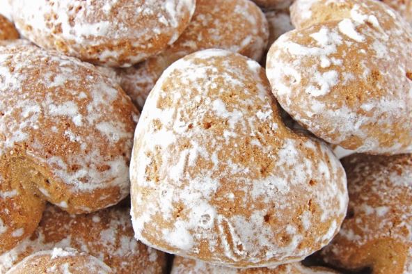 Zatim dodajte omekšali med, mlevene orahe, struganu koru i sok od limuna, rum i sodu bikarbonu. Masu dobro izmešajte, pa postepeno dodajite brašno. Umesite testo i razvijte ga debljine prsta. Modlicama u obliku srca vadite medenjake, ređajte ih u namašćenu tepsiju i pecite na blagoj vatri, da ostanu svetle boje.