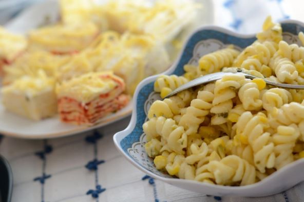 Priprema: Testeninu skuvamo sa malo soli al dente. Kukuruz šećerac skuvamo u slanoj vodi 5-8 minuta. Mladi crni luk naseckamo na sitnije komade.