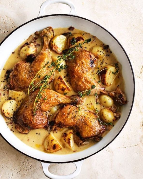 3. Stavite poklopljen sud u rernu na 10 minuta. Zatim sklonite poklopac i dodajte tamijan i kuvajte dodatnih 10 minuta ili dok piletina ne pozlatni, a krompir je u potpunosti skuvan.
