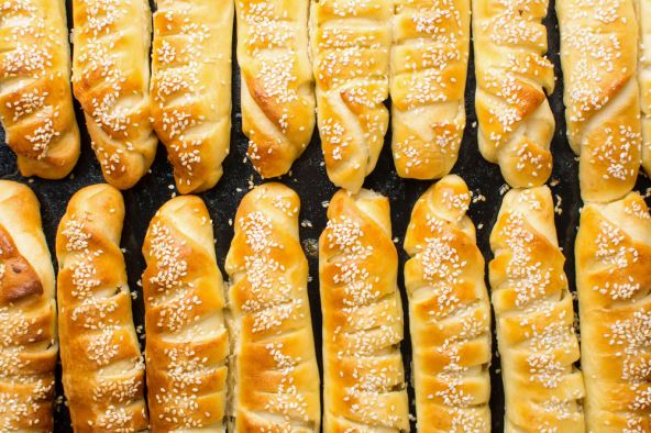 Premazati preostalim umućenim belancima, posipati susamom i peći u rerni zagrejanoj na 200 stepeni oko 15 minuta sa ventilatorom, a malo duže bez.