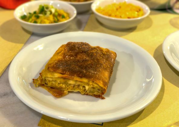 Staviti jednu koru, pa je poprskati mešavinom od 1 dl kisele vode, pomešane sa 20 ml ulja. Posuti nadevom, pa pokriti drugom korom. Ponovo poprskati mešavinom kisele i ulja, posuti nadevom, pa pokriti trećom korom. Poprskati, posuti nadevom i umotati u rolat. Rolat složiti u pleh obložen pek papirom. Ponoviti postupak sa ostalim korama. Kada su svi rolati uvijeni i složeni, preliti mešavinom kisele vode i ulja i po želji posuti susamom. Peći u rerni zagrejanoj na 200 C, dok ne porumeni. Pečenu pitu pokriti krpom i ostaviti 10-tak minuta, a zatim je seći i služiti.