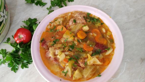Priprema: Kupus iseći na kocke veće i pola poredjati u šerpu. Odozgo poredjati mleveno meso, suvu slaninu, isečenu papriku, šargarepu isečenu , na kolutove, celer na kocke praziluk na kolutove i krupne grane celera koje izvadimo kad se kupus skuva. Preko toga stavim drugi deo isečenog kupusa. Naljemo vodom do pola šerpe i stavimo da se kuva na srednjoj temperaturi oko 50 min.