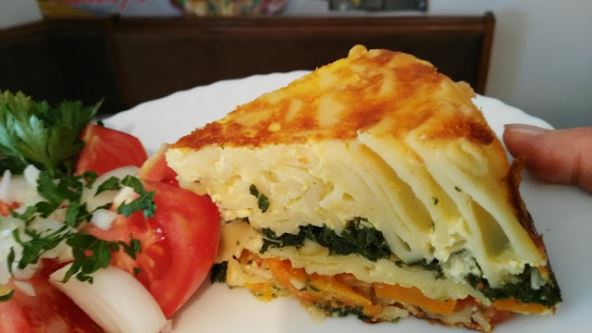 Staviti nekoliko kašika makarona na dno, pa odozgo staviti luk i šargqarepu, zatim red makarona, zatim seckane blitve, pa opet makarone, pa zatim kolutove paradajza i odozgo makarone.