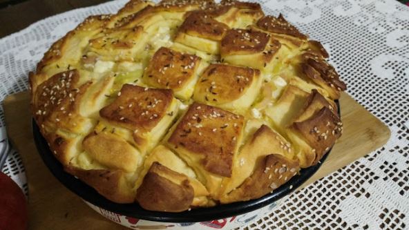 Zatim opet razviti tri kore i mazati margarinom i na treću dodati drugu polovinu luka i sira. Razviti i mazati i zadnje tri kore i staviti preko nadeva. I treću odozgo premazati margarinom. Pitu iseći na kocke željene veličine. Umutiti žumance i premazati, pa ostaviti 15 minuta da malo naraste i peći na180 stepeni 40-45 min.