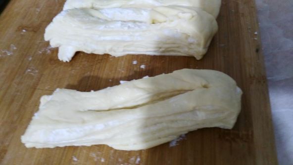 Priprema: Kvasac rastopiti u malo mlake vode, dodati šećer, jogurt, 2 jaja, brašno i so pa umesiti srednje tvrdo glatko testo i ostaviti 30 minuta da naraste. Naraslo testo razviti i podeliti na 7 loptica. Svaku lopticu razviti što tanje i premazati je razmekšanim maslacem, a preko njega izmućenim sirom. Svaku lopticu razvući pa stavljati jednu preko druge. Poslednju razvijenu ne premazivati. Testo mora biti pravougaonog oblika. Preseći ga na pola po dužini, pa na trake širine oko 3 cm.
