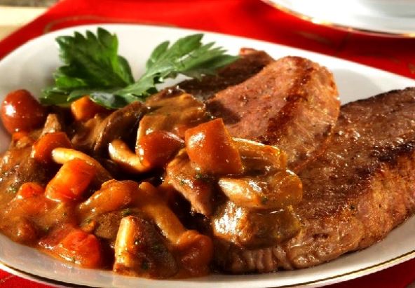 Sastojci: 700 grama telećih šnicli, 500 grama svežih šampinjona, 180 grama putera, pola čaše brašna, 1 limun, mleveni beli biber, 150 mililitara belog vina, 60 mililitara konjaka, 1 kesica praška za instant pirea, 200 mililitara mleka, ulje, so, mleveni crni biber