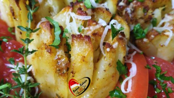Krompir očistiti oprati i odseći vrh na jednoj strani. Zatim po dužini od polovine zaseći na 3-4 mesta, zakrenuti ga i ponovo da dobijete nasečene kocke. U činiju sipati malo ulja i dodati sve naseckane začine i dobro izmešati i puniti krompir u otvore na krompiru. Ređati u pleh tako da krompir stoji na onoj ravnoj odsečenoj strani..