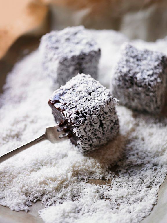5. Kada se testo ohladi, isecite ga na kockice, umačite u mlaku glazuru i uvaljajte u kokos.