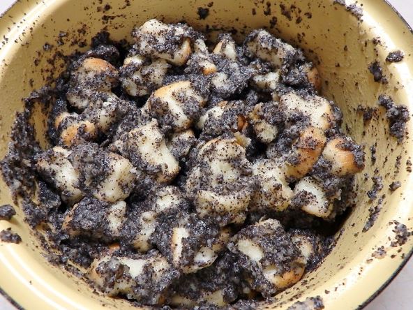 Pečeno testo prvo ohladite, zatim ga secite na komadiće oko 2 cm i spuštajte u prokuvanu vrijuću vodu i mešajte oko 5 minuta. Zatim ih procedite i premestite u drugu posudu. U takve još vruće bobaljke dodajte prethodno skuvan mak, a zatim sve prelijte medom i promešajte.