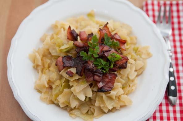 Skuvati flekice u vodi, pa izmešati sa prženim kupusom. Dodati malo mlevenog bibera.