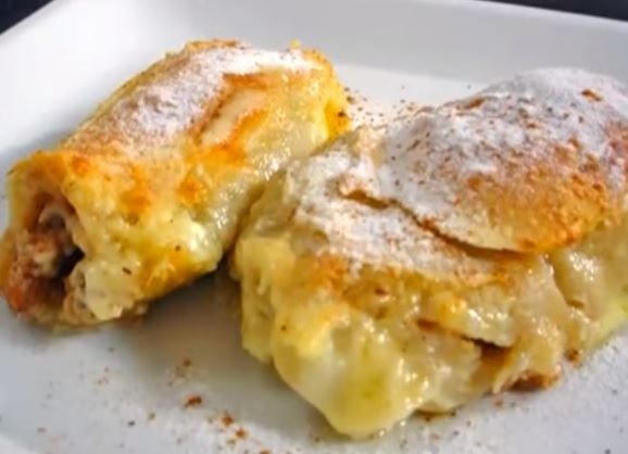 Uz pomoć stolnjaka (dižući ga od sebe, prema gore) zamotati testo. Ivicom dlana utiskivati testo između punjenih delova i seći štruklice ivicom tanjira.