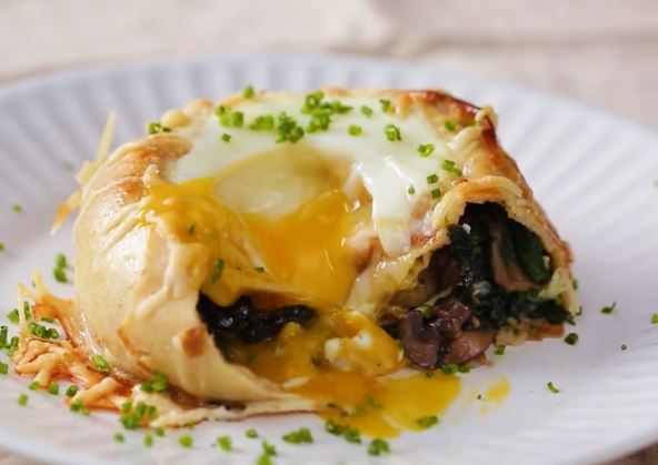 Dve palačinke postavite kao na videu. Stavite u njih nadev iz tiganja i nekoliko kockica kozijeg sira, premažite žumancetom sa unutrašnje strane i urolajte. Tako urolane, još jednom sa spoljašnje strane premažite žumancetom.