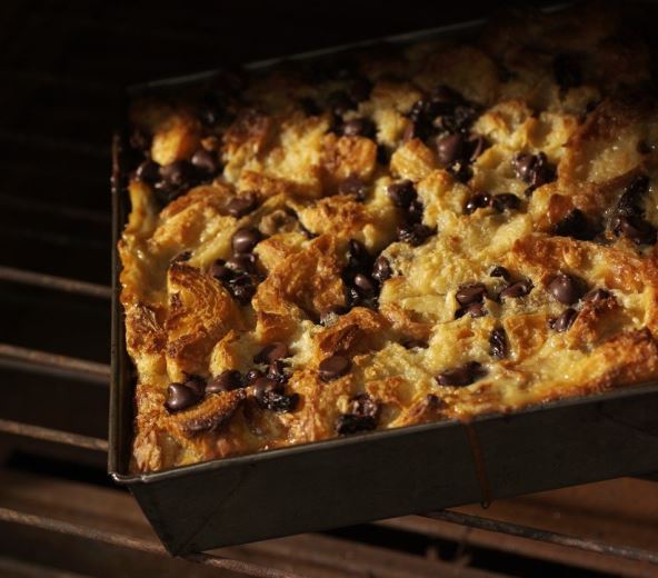 Polovinu isečenog hleba stavite u pleh, preko pospite sa polovinom mrvica od putera i sa polovinom suvog grožđa. Zatim stavite preostali hleb, opet mrvice putera, pa zalijte sa umućenim jajima, mlekom i slatkom pavlakom. Pospite sa preostalim grožđem.