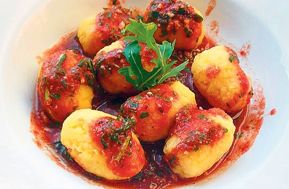 Vodu staviti u šerpu, dodati ulje i so. Kad provri, dodati kukuruzno brašno i mešati polako kulinarskom žicom da ne bude grudvica. Kad se zgusne, ostaviti po strani da se malo ohladi kako biste mogli da uzimate komade veličine oraha i oblikujete njoke.