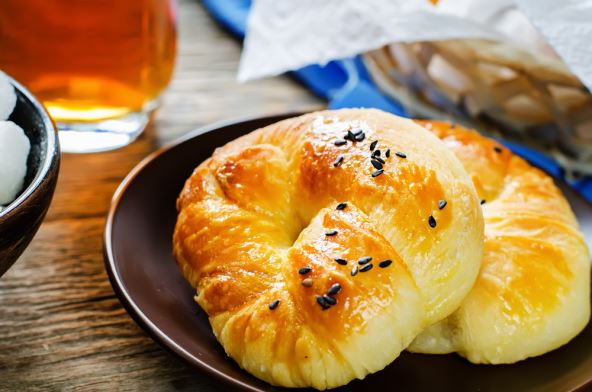 Nadošlo testo podeliti na loptice. Loptice ostaviti da nadođu. Svaku lopticu razviti elipsasto i premazati sa malo omekšalog putera. Testo iseći u tračice i uviti, pa premazati neumućenim belancetom i posuti susamom i čurekotom. Peći 30 minuta na 180 stepeni. Prijatno!