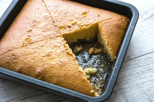 Kada se ispeče, ohladiti i seći na kockice. Šećer ušpinovati sa malo vode i preliti isečen kolač. Ostaviti da se dobro ohladi u frižideru, najbolje preko noći.