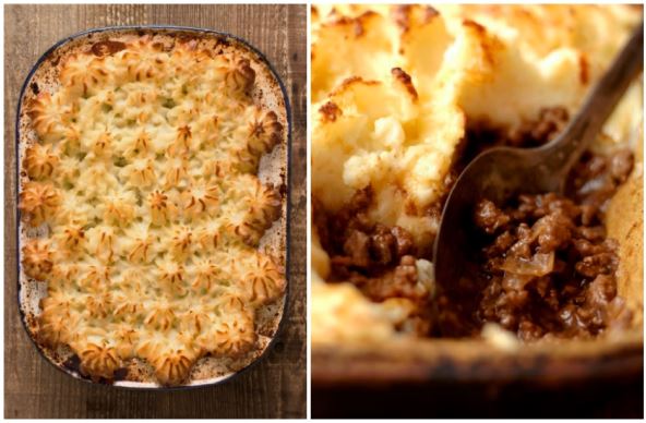 Sastojci: 500 g mlevenog mesa, pola glavice luka, 2 šargarepe, 200 g pelata, kašika putera, 3∕4 kašike brašna, kašika peršuna, 600 g krompira, 3 kašike mleka, malo bosiljka.