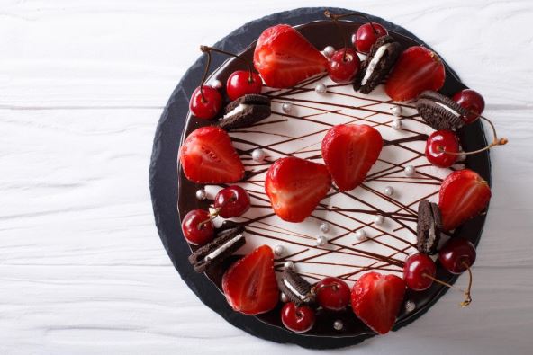 Kada se ohlade, oba kolača po dužini presecite napola. Svaku polovinu premažite ganašom. Stavite belu glazuru oko torte. Polako sipajte ganaš preko kolača tako da čokolada kaplje na tortu. Ukrasite mešavinom bobičastog voća.