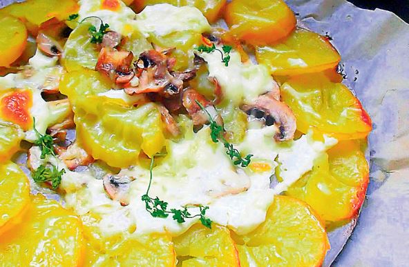 Krompir obariti u ljusci, pa ga potom očistiti i iseći na kolutove. Okrugli pleh obložiti papirom za pečenje i malo ga nauljiti. Poređati krompir u prvi krug, pa do njega oprane i na štapiće isečene šampinjone. Do njih opet poređati krompir i na kraju, u sredinu, staviti šampinjone. Sve posoliti i staviti u rernu da se peče. Posle dvadesetak minuta odozgo narendati mocarelu, posuti peršun i još nekoliko minuta vratiti u rernu da se zapeče. Jelo poslužiti toplo.