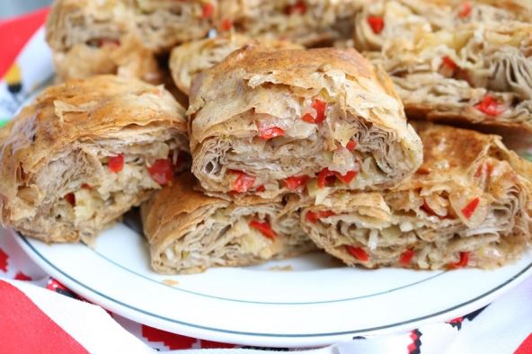 Prvu koru raširiti na sto pouljiti je. Uzeti sledeću i zgužvati je kao harmoniku pa staviti preko i tako još dve jednu do druge. Između rasporediti prženi kupus, saviti ivice i uviti u rolat.