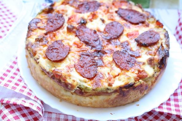 Razviti testo i obložiti podmazanu tepsiju ali malo i ivice sa strane. Obložiti ivicu unutra i listovima slanine, a preko tankim kolutovima tikvice. Sipati izdinstanu slaninu i tikvicu.