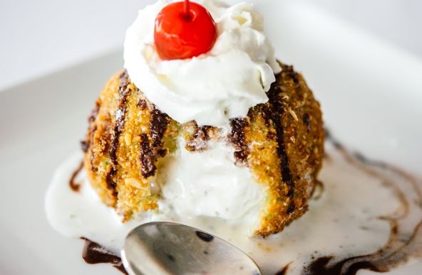 Umutite i drugo jaje, uvaljajte sladoled ponovo u njega u stavite u jako zagrejanu masnoću na nekoliko sekundi. Servirajte odmah pržen sladoled garnirajući sa voćem ili topingom. Uživajte!