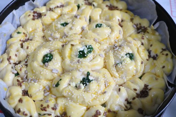 600 - 700 g brašna, 1 kašičica šećera, kockica kvasca, malo soli, 400 ml mleka, 50 ml ulja, vezica blitve ili spanaća, 200 g sira, semenkice, krupna so