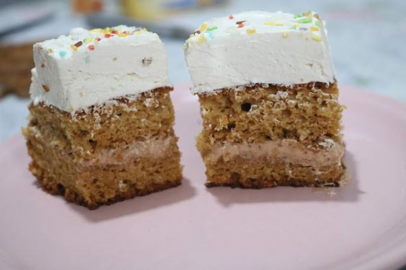 Kad se ohladi preseći na pola, pa namazati džemom, tankim slojem šlaga i po odozgo staviti šlag. Ostaviti u frižideru oko 2 sata, pa seći na na kocke i služiti.