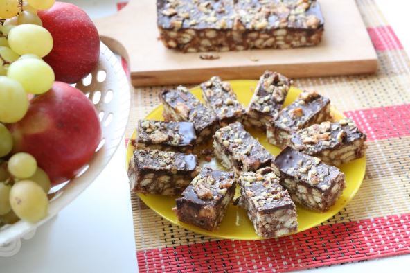 350 g keksa, 200 g oraha, 100 g karamela, 125 g margarina, 150 g čokolade, 100-200 g šećera, 200 ml vode ili mleka