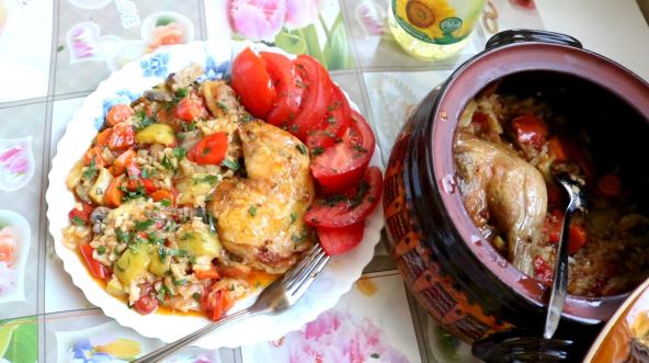 Sve dinstati polako pa dodati opran pirinač, biber, so, začin, mlevenu papriku i paradajz na kocke. Još malo dinstati. Sipati u đuveč. Ne treba dolivati vode.