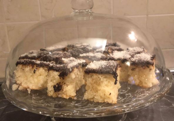 Sastojci: 2 čase kiselog mleka ili gustog jogurta, 1,5 čaša šećera, 2,5 čaše brašna, čaša ulja, 100 g kokosovog brašna, 1 prašak za pecivo + 200 g čokolade za glazuru (može i manje) i još malo kokosa za ukrašavanje.