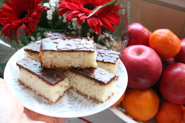 2 kisela mleka, 1 i po čaša brašna (časa od 200 g), 100 g kokosa, 1/2 čaše šećera, 1/2 čaše ulja, 1 prašak za pecivo, 100 gr čokolade
