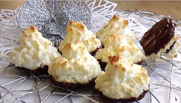 200 g kokosa, 60 g mladog neslanog kremastog, 140 g šećera, 4 belanca, 1 kesica vanilin šećera, malo arome ruma, prstohvat soli, 120 g crne cokolade za umakanje