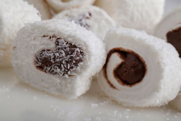 Nakon toga, nožem isecite trake širine od oko četiri-pet centimetara, a zatim svaku traku na polovini dužine presecite na pola. Krenite od ivice da savijate u rolat, tako da kokos ostaje sa spoljašnje strane. Budite vrlo nežni, da se kremasti kolač ne bi raspadao.