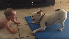 Situacija koja se pamti: Buldog čini sve da nasmeje bebu! (VIDEO)