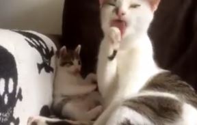 Najslađa lekcija: Mače uči od mame kako da se kupa! (VIDEO)