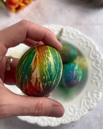 Rastvorite boje u vreloj vodi i dodajte sirće. Obucite rukavice. Uz pomoć kašike, na papirnati ubrus polijte boje na bilo koji način, zatim na sredinu stavite kuvano jaje, umotajte ga i zategnite, na primer, gumicom. Ostavite sat vremena, ili bolje da se osuši. Pažljivo otpakujte i gotovo! Sada možete uživati u njima.