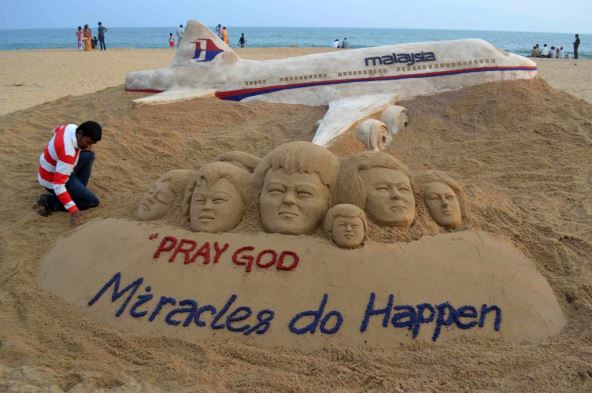 Na plaži u Puriju u istočnoindijskoj državi Odiši osvanula je skulptura umetnika koji je tim putem pružio moralnu podršku putnicima malezijske avio kompanije, čiji je avion nestao u subotu