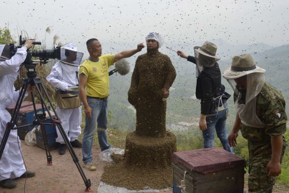 Kako prenosi agencija AFP, 34-godišnji pčelar iz jugozapadnog kineskog grada Čongćing, prekrio je telo pčelama čija je težina premašila 45 kilograma.