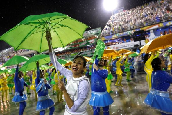 Uprkos jakoj kiši, na desetine hiljada ljudi otpratilo je uz zaglušujući ritam muzike elitne plesne škole koje su u šarenim, svetlucavim kostimima prodefilovale u nedelju na čuvenom "sambadromu" u Riju de Žaneiru.