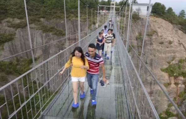 Ovakav scenario se dogodio grupi turista koji su vrišteći pohitali prema kraju staklenog mosta na Juntai planini stvorivši umalo smrtonosan stampedo. U trenutku prelaska staklenog mosta, koji se nalazi na planini u kineskoj pokrajini Henan, most je počeo da puca. Grupu turista koja se u tom trenutku nalazila na staklu debelom 68 centimetara ispod kojeg se širi provalija od više od 1.000 metara, obuzeo je strah pa su odmah pohitali prema kraju mosta.