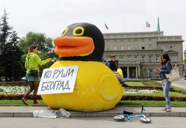 Inicijativa "Ne davimo Beograd" postavila je danas oko 12 sati ispred Skupštine grada Beograda figuru patke sa maskom "fantomkom", u znak protesta zbog rušenja objekata u Savamali, koje su obavili maskirani nepoznati počinioci.