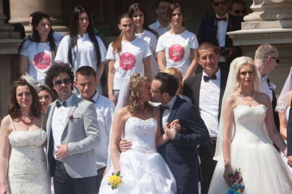 Ispred Skupštine grada Beograda danas je održano kolektivno venčanje, a sudbonosno "da" izgovorilo je 110 mladenaca.