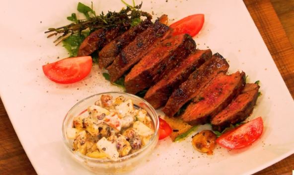 Priprema: Goveđe meso izbockajte viljuškom pa utrljajte so i biber. U zagrejan tiganj na malo putera stavite da se meso prži. U tiganj dodajte i struk majčine dušice i 2 čena belog luka i još malo maslaca. Kada se meso proprži dobro s jedne i s druge strane isecite ga na manje komade pa servirajte u tanjir na rukoli.